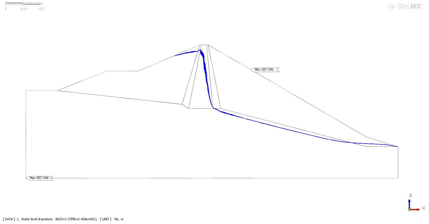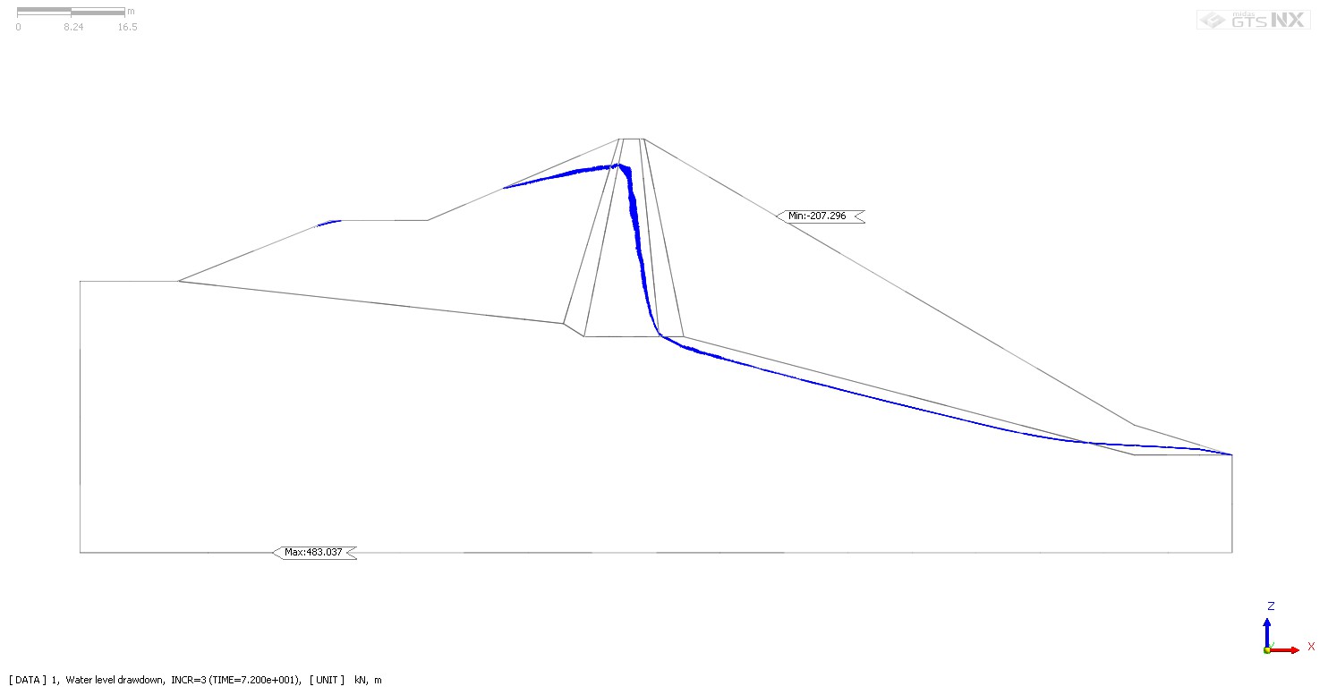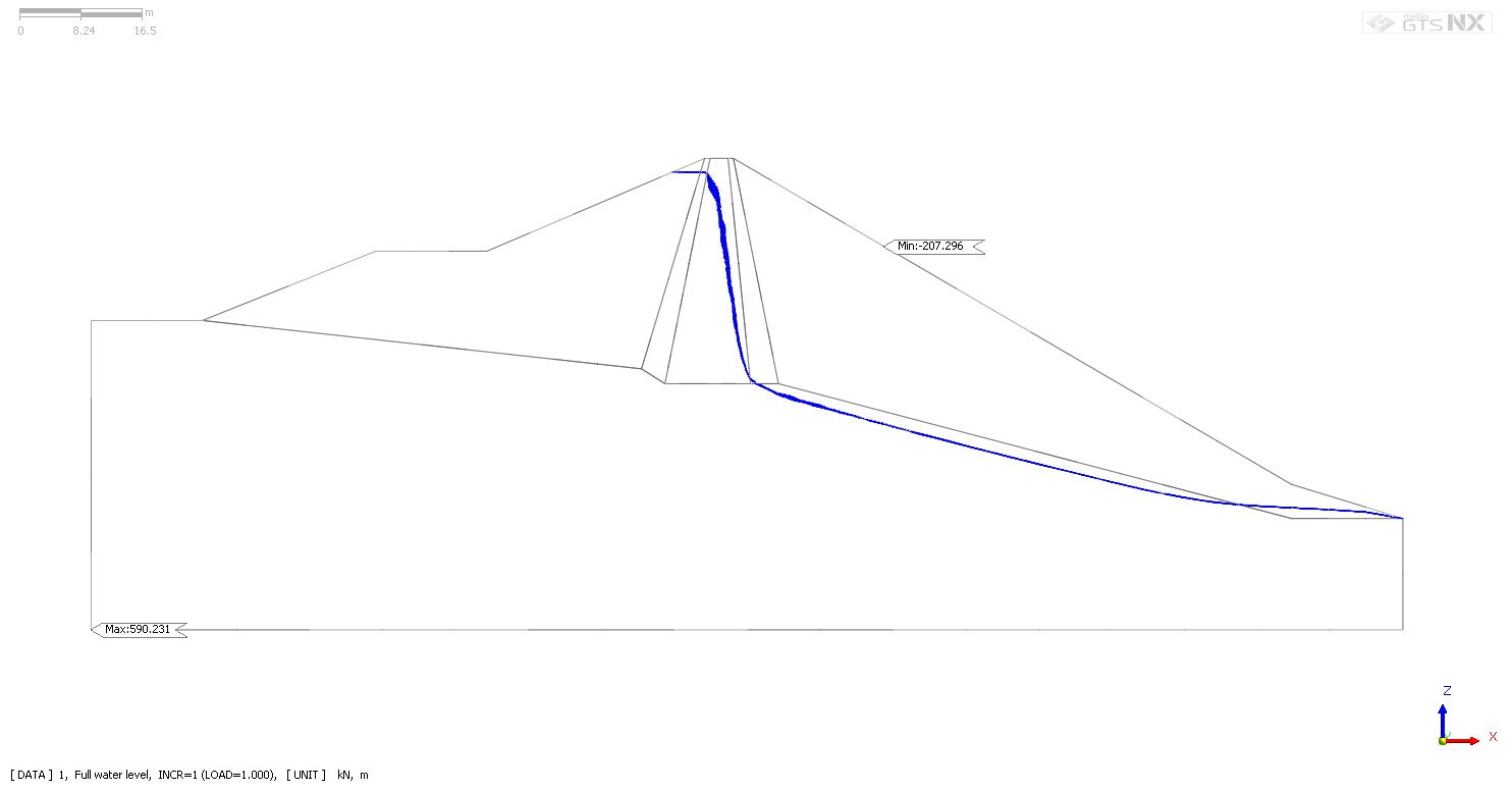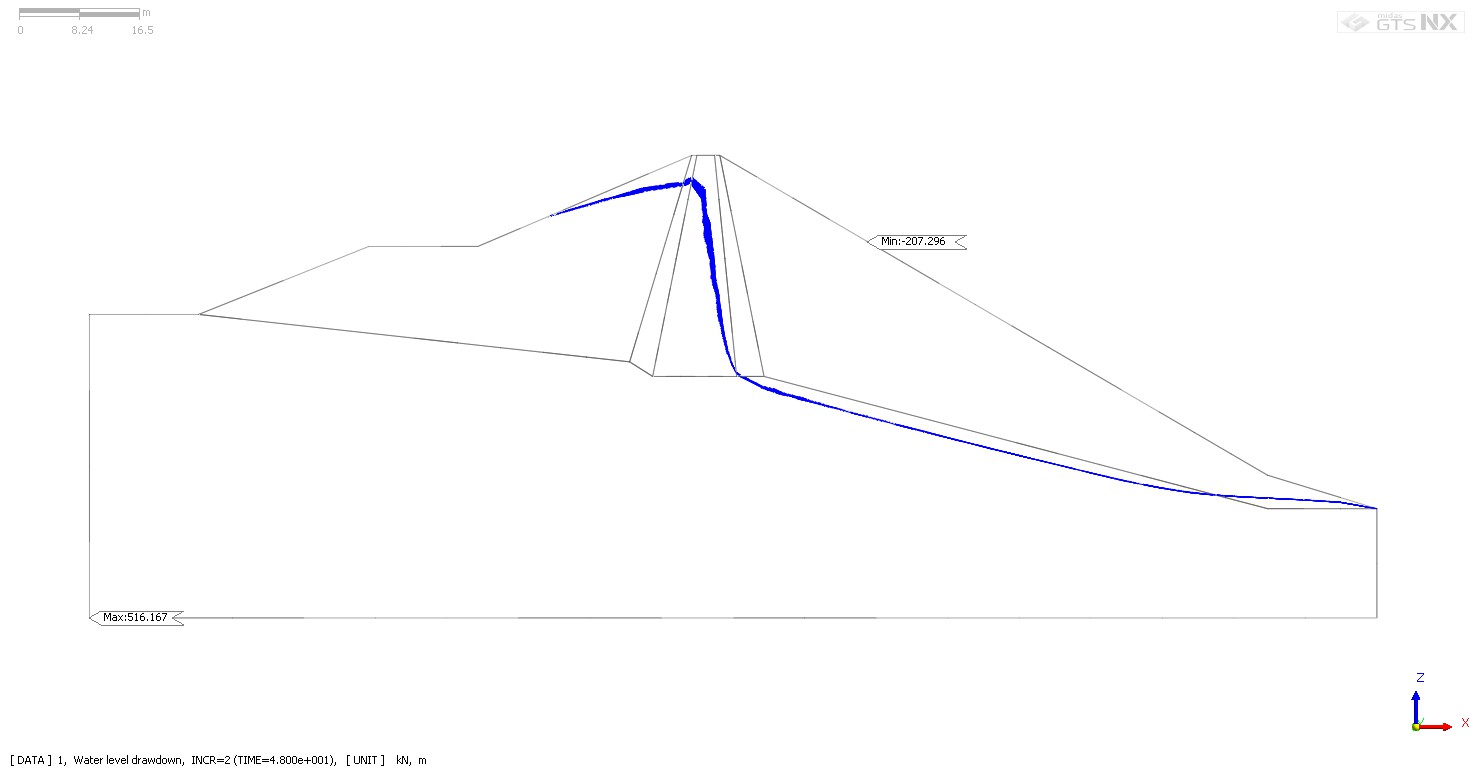Рис. 4 – Верификация положения кривой депрессии в теле исследуемой плотины: – (синяя линия) численный расчет положения кривой депрессии;