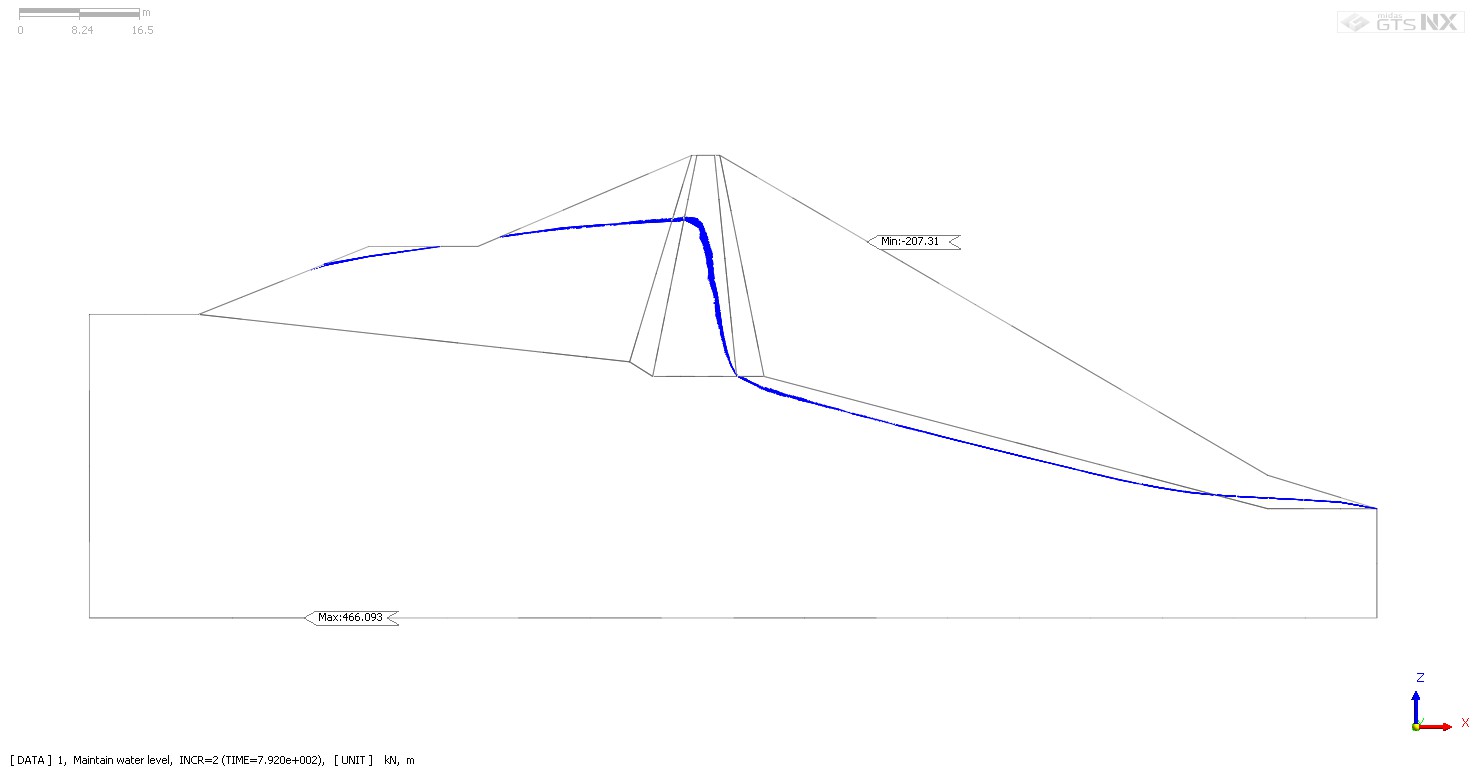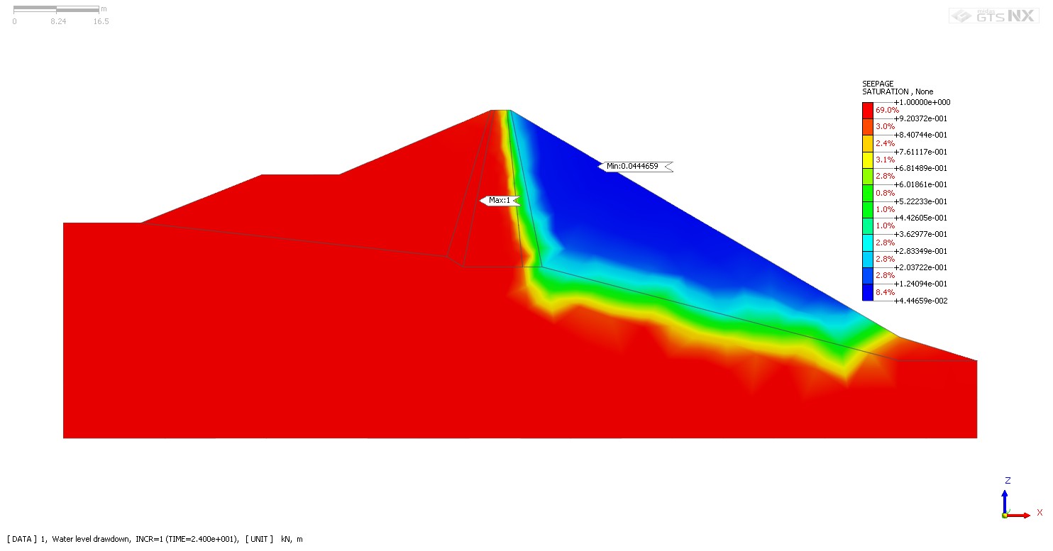 Обратим внимание на ядро плотины. Часть ядра плотины находится в зоне сатурации с показателем равным 1. Это говорит о том, что конструкция ядра недостаточно изолирует нижний откос от избыточного влагонасыщения, следовательно, такая ситуация может привести к обрушению нижнего откоса, о чем свидетельствует «синяя» зона, расположенная на всей площади нижнего откоса.