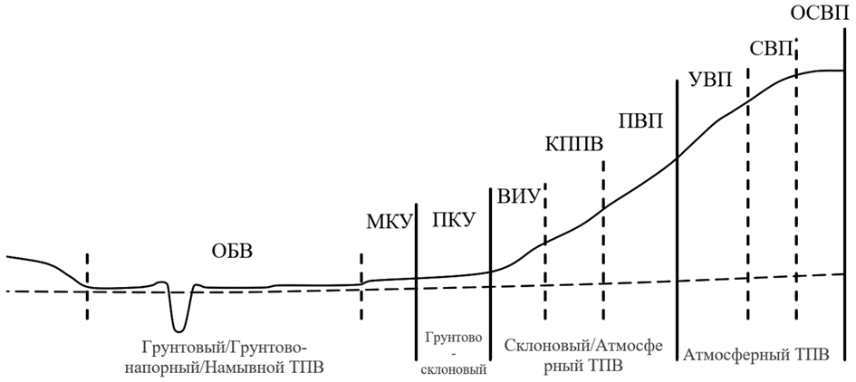 Результаты и обсуждение. Запасы влаги в почвенных водохранилищах неоднородны в пространстве и во времени, изменяются в соответствии с почвенной неоднородность, например на мезоуровне, т. е. на уровне катены. Катены отражают закономерную последовательность размещения типов почв на склонах [21], формируя агрогидрологические районы. Их влагозапасы и представляют своего рода почвенные водохранилища. На европейской части России выделяются девять агрогидрологических районов (рис. 1) [14]: ОБВ (обводнение); МКУ (максимального капиллярного увлажнения); ПКУ (периодического капиллярного увлажнения); ВИУ (временно-избыточного увлажнения); КППВ (увлажнения капиллярно-подвешенной и капиллярно-подперто-подвешенной влагой); ПВП (полного весеннего промачивания); УВП (умеренного весеннего промачивания); СВП (слабого весеннего промачивания); ОСВП (очень слабого весеннего промачивания). Вверх по склону влагозапасы закономерно уменьшаются, вследствие оттока воды с вышерасположенных участков в пониженные элементы рельефа местности. Переток оценивается в 170…280 мм (рис. 2) от района ОСВП до ОБВ или примерно 56…93 мм составляют перетоки между тремя районами (верхняя часть склона, средняя и нижняя). Это сопоставимо с величиной оросительной нормы. Например, на территории европейской части России для кормовых культур средняя оросительная норма составляет 192 мм (изменяясь в пределах 77…555 мм), а для многолетних трав – 266 мм (89…747 мм). Для условий степной зоны величина коэффициента водопотребления капусты изменяется от 55 до 114 м3 /т [2].